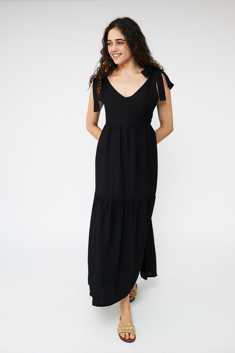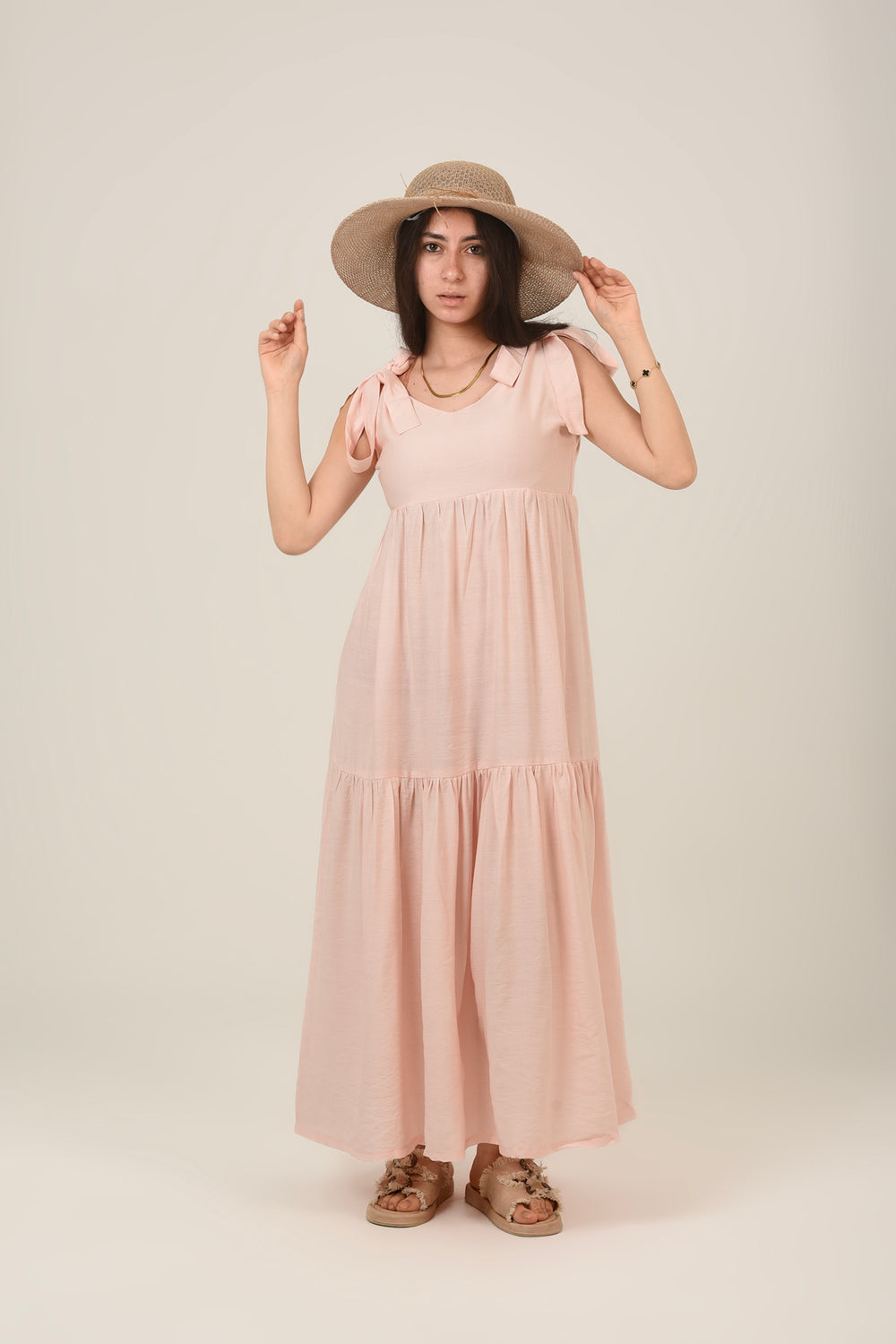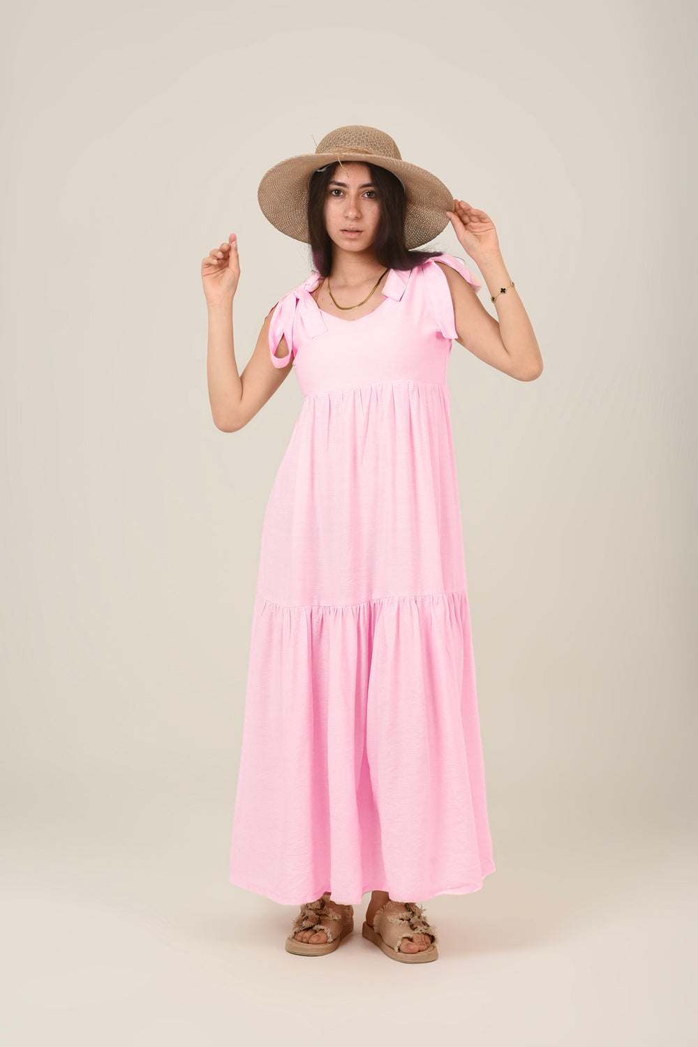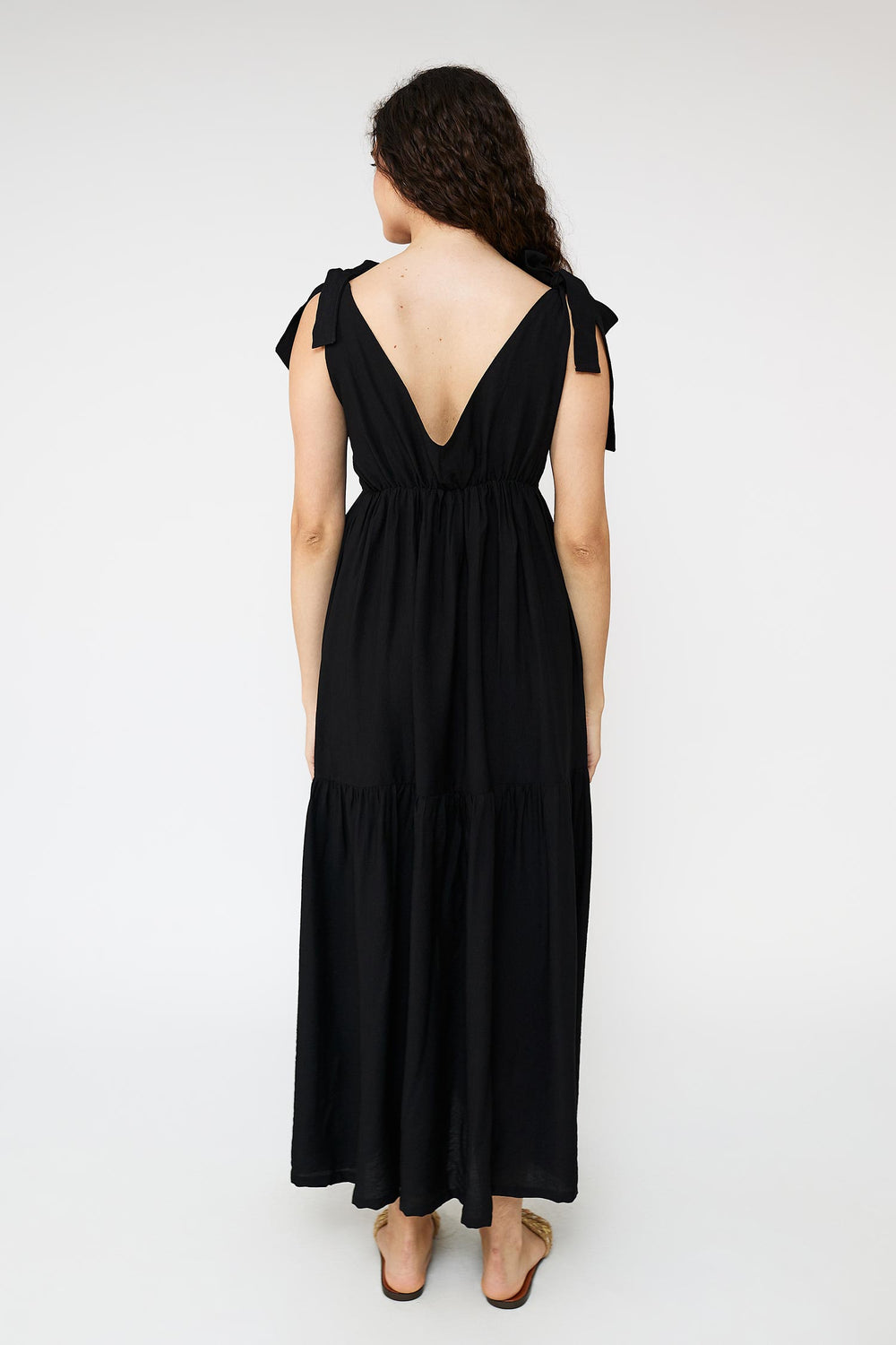 This full length V-neck dress, featuring a flattering neckline at both the front and back, is a stylish and versatile addition to your summer wardrobe. The adjustable shoulder ties allow you to customize the neckline depth for your comfort and style.