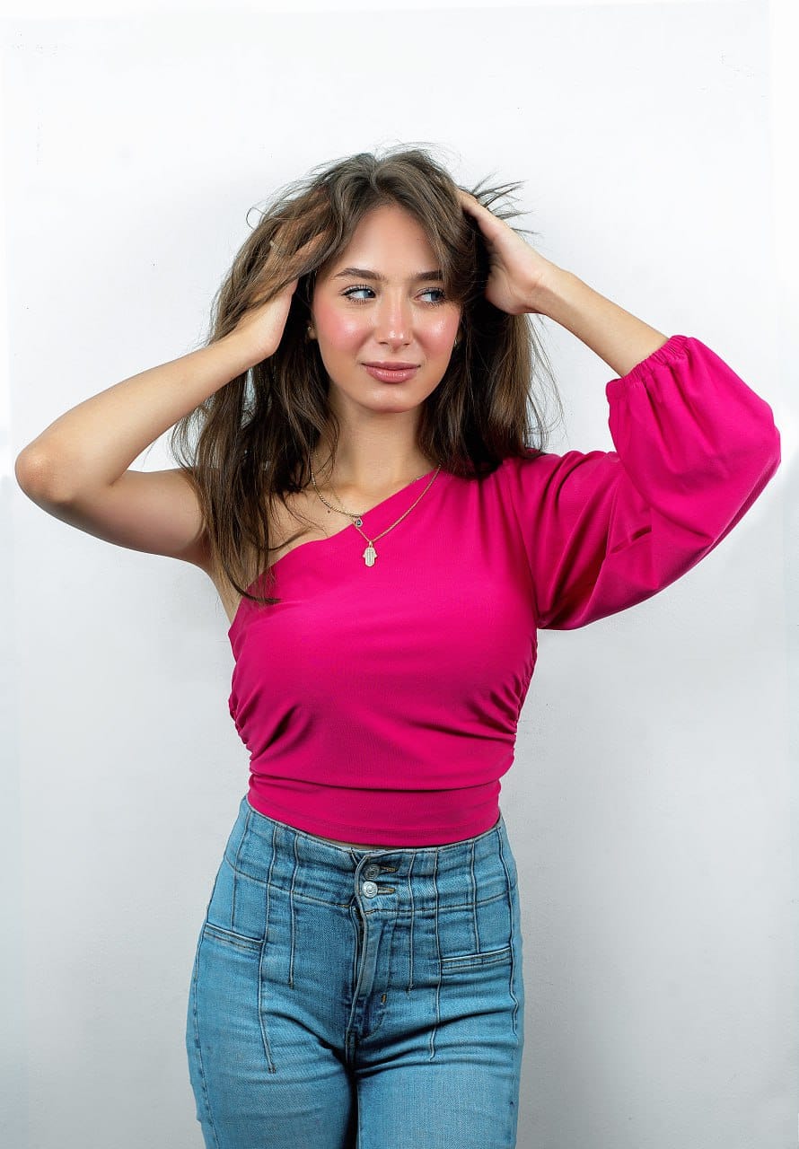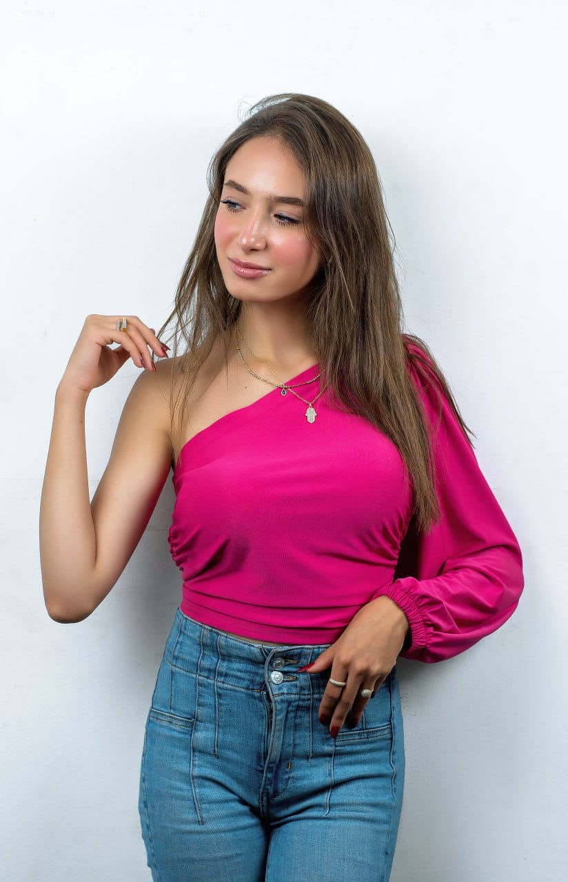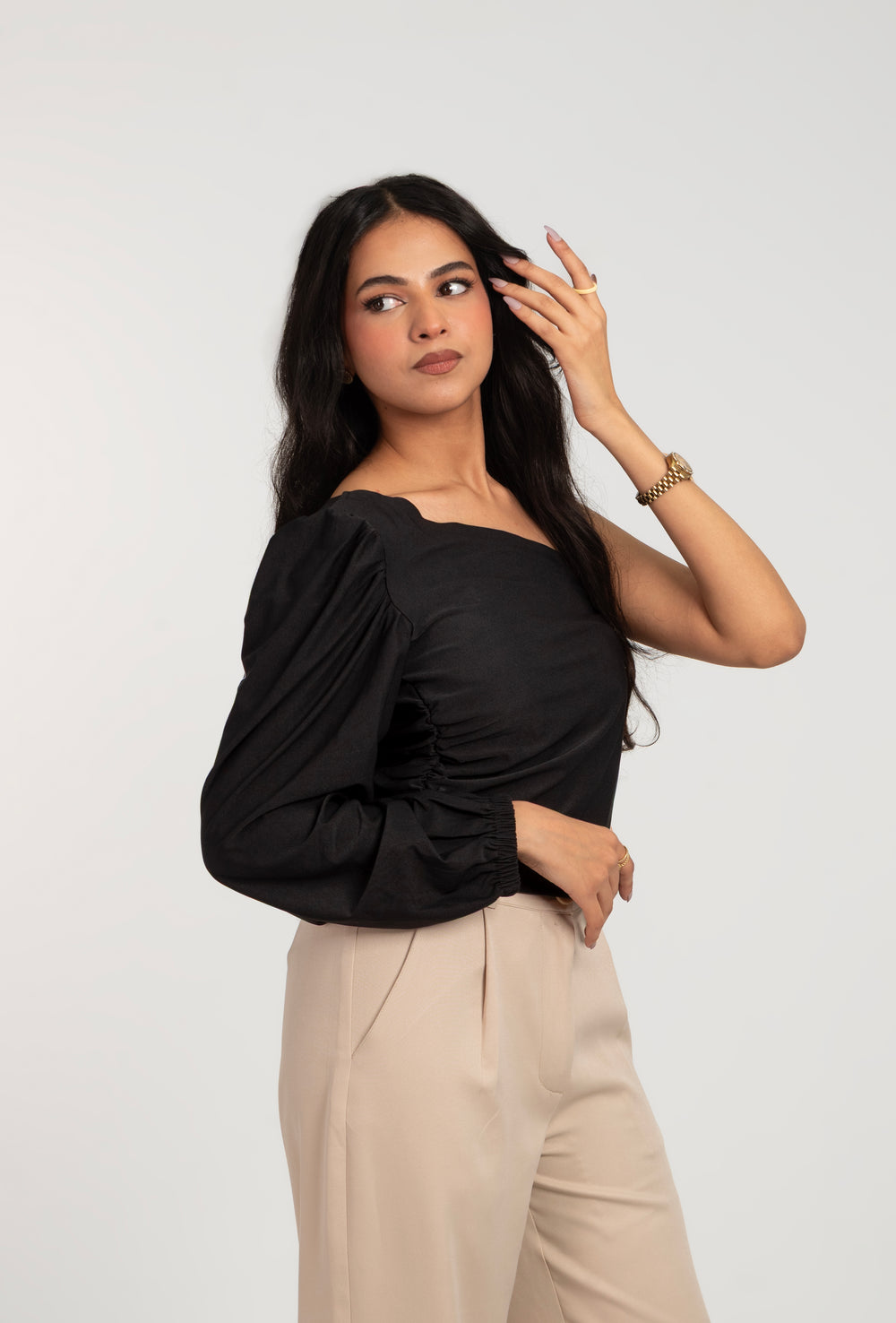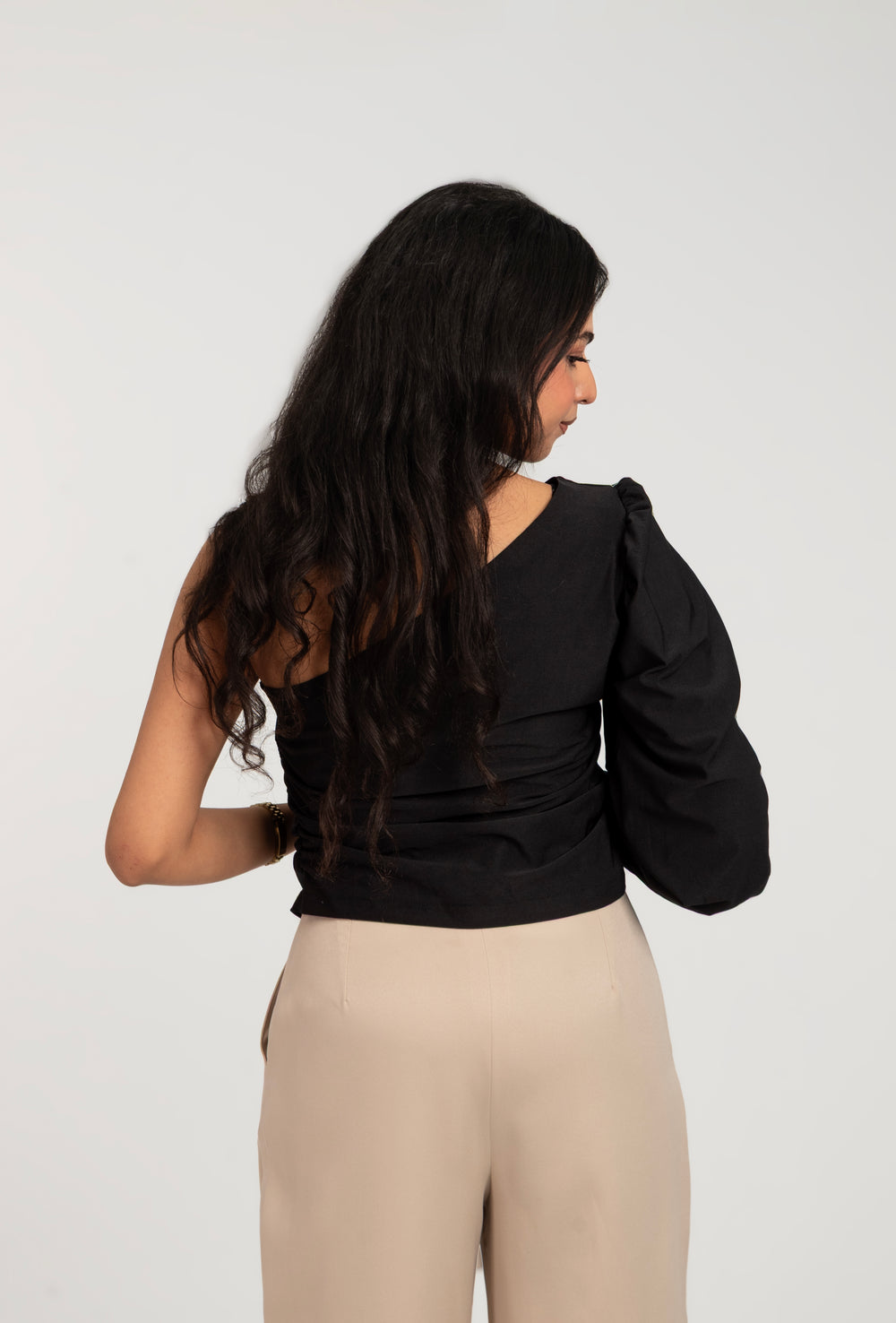 The ideal one-shoulder top for your night outs, this top can easily be dressed up or down depending on the occasion. Wear it with a pair of jeans for a more dressed down look or pair it with your favorite pair of black trousers and heels with a sleek bun for a more dressed up look.
