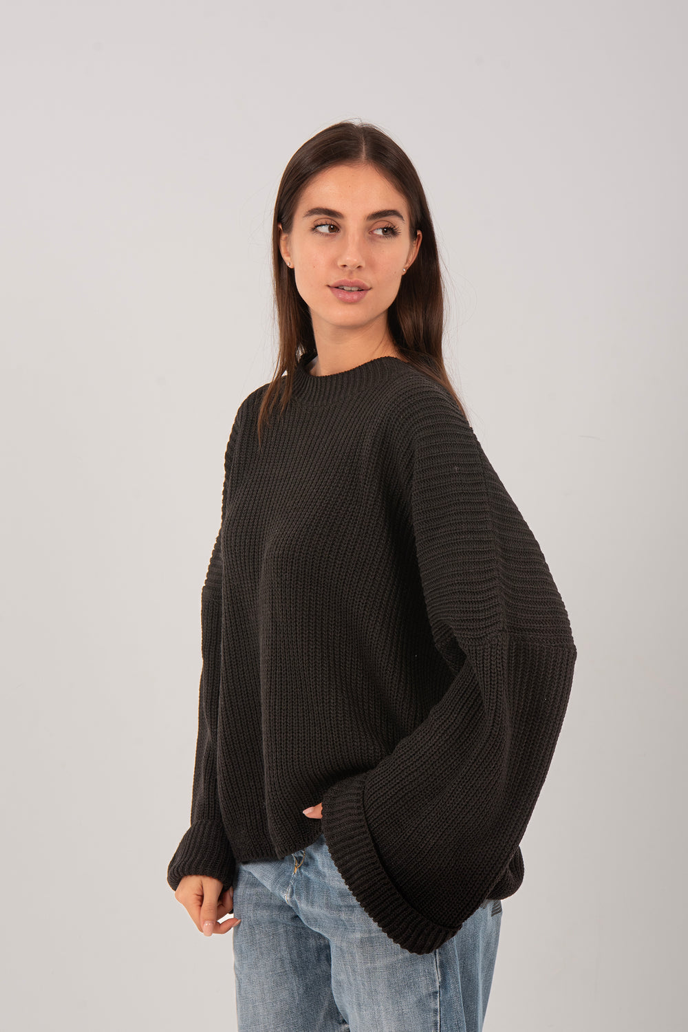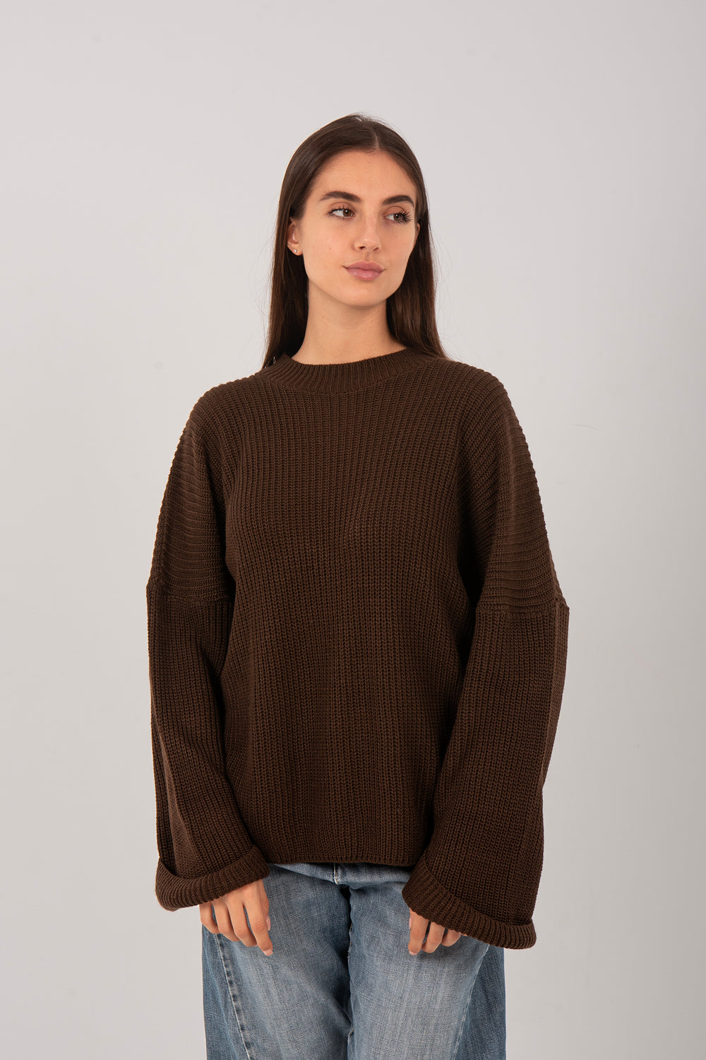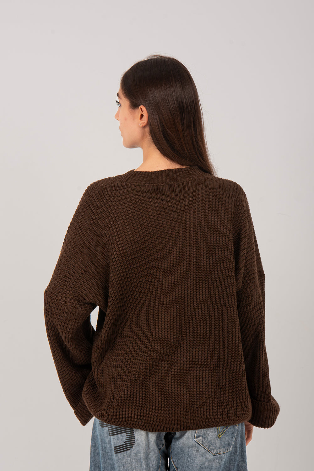 This oversized knitted pullover for women is crafted from soft wool for a warm, cozy feel. Designed with a minimalist knit texture and a loose, relaxed fit, it provides effortless comfort and a modern silhouette. The wide sleeves and drop-shoulder design add a casual yet chic touch, making it a versatile choice for everyday wear. Perfect for cozy days, casual outings, or layering during cooler weather.