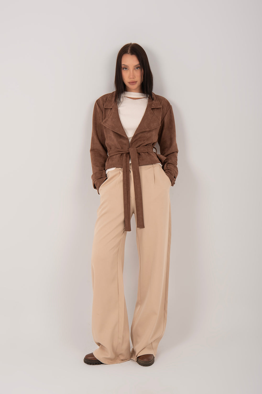 Suede Cropped Belted Jacket for Women Chic and versatile, this cropped suede jacket features a waist belt and sleeve straps for a modern, defined look. Crafted from soft, high-quality suede with a smooth lining for all-day comfort — perfect for layering from day to night.