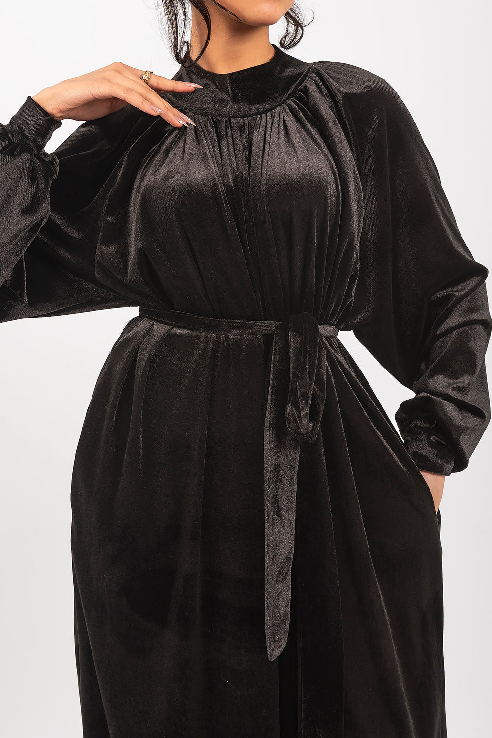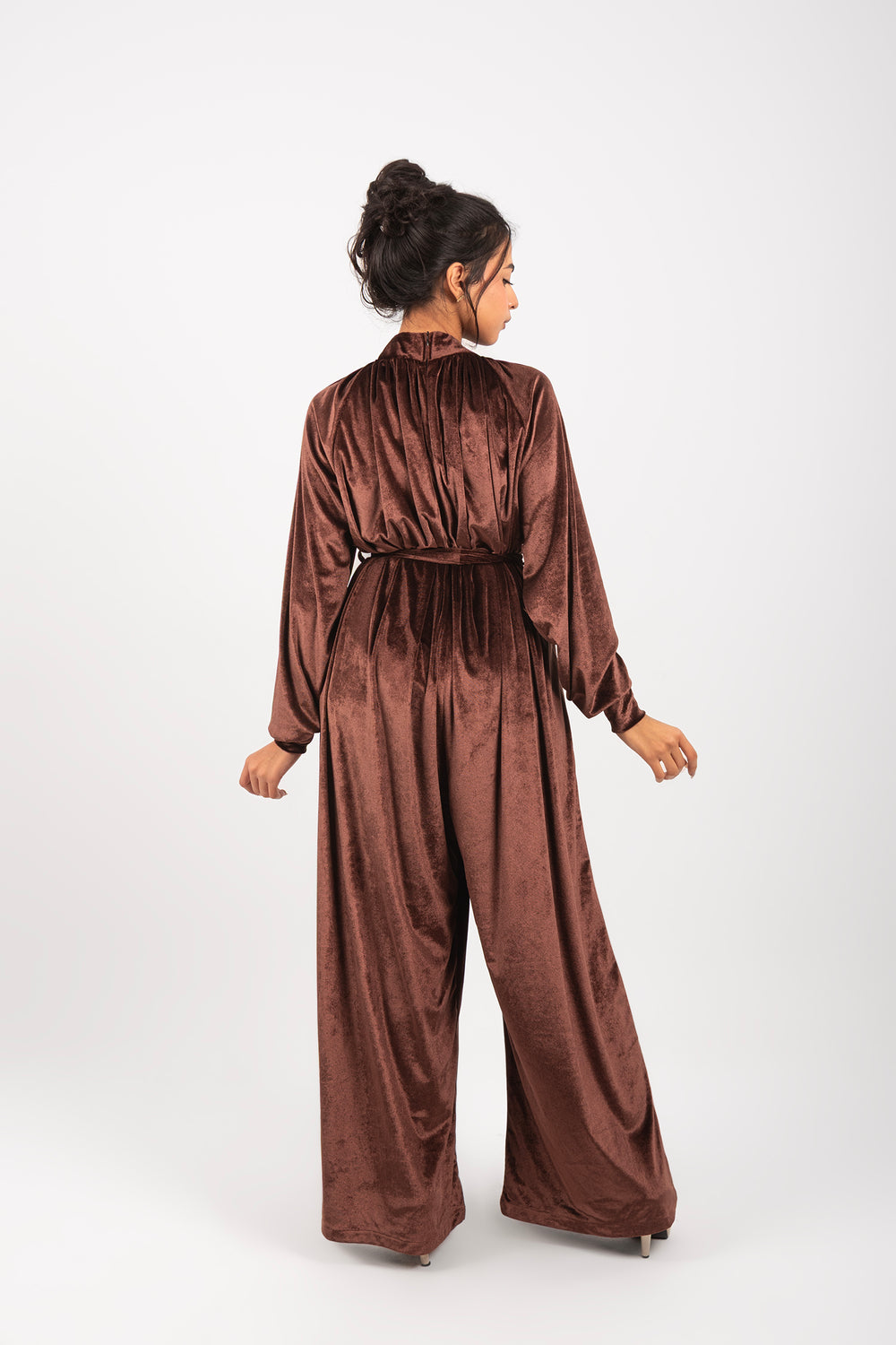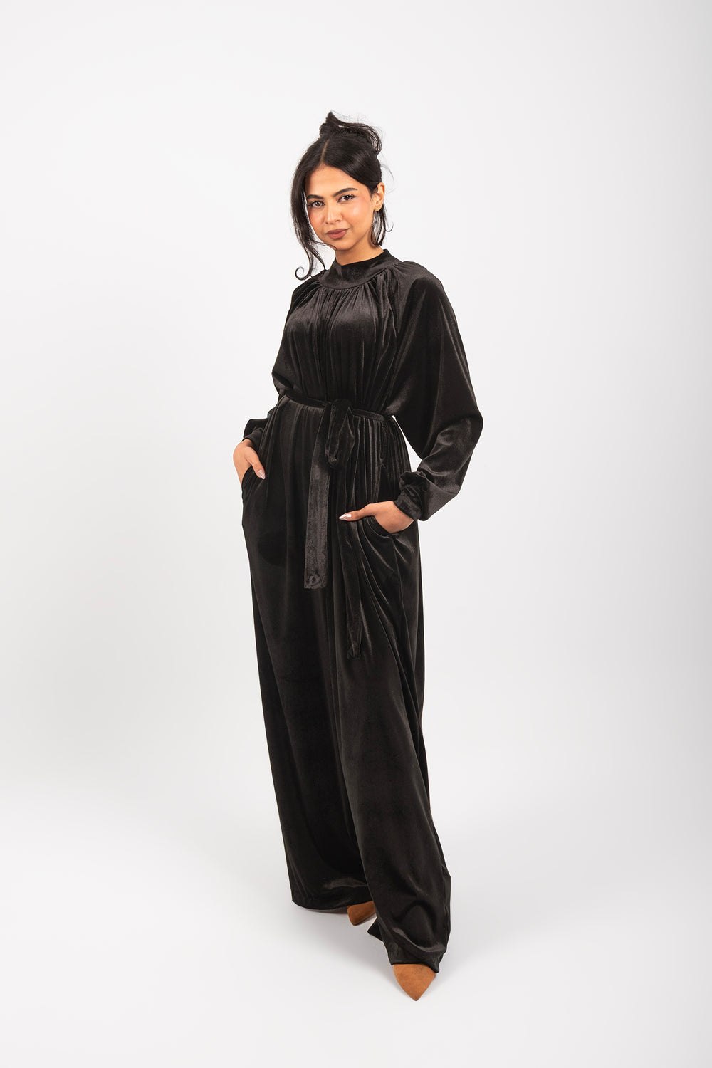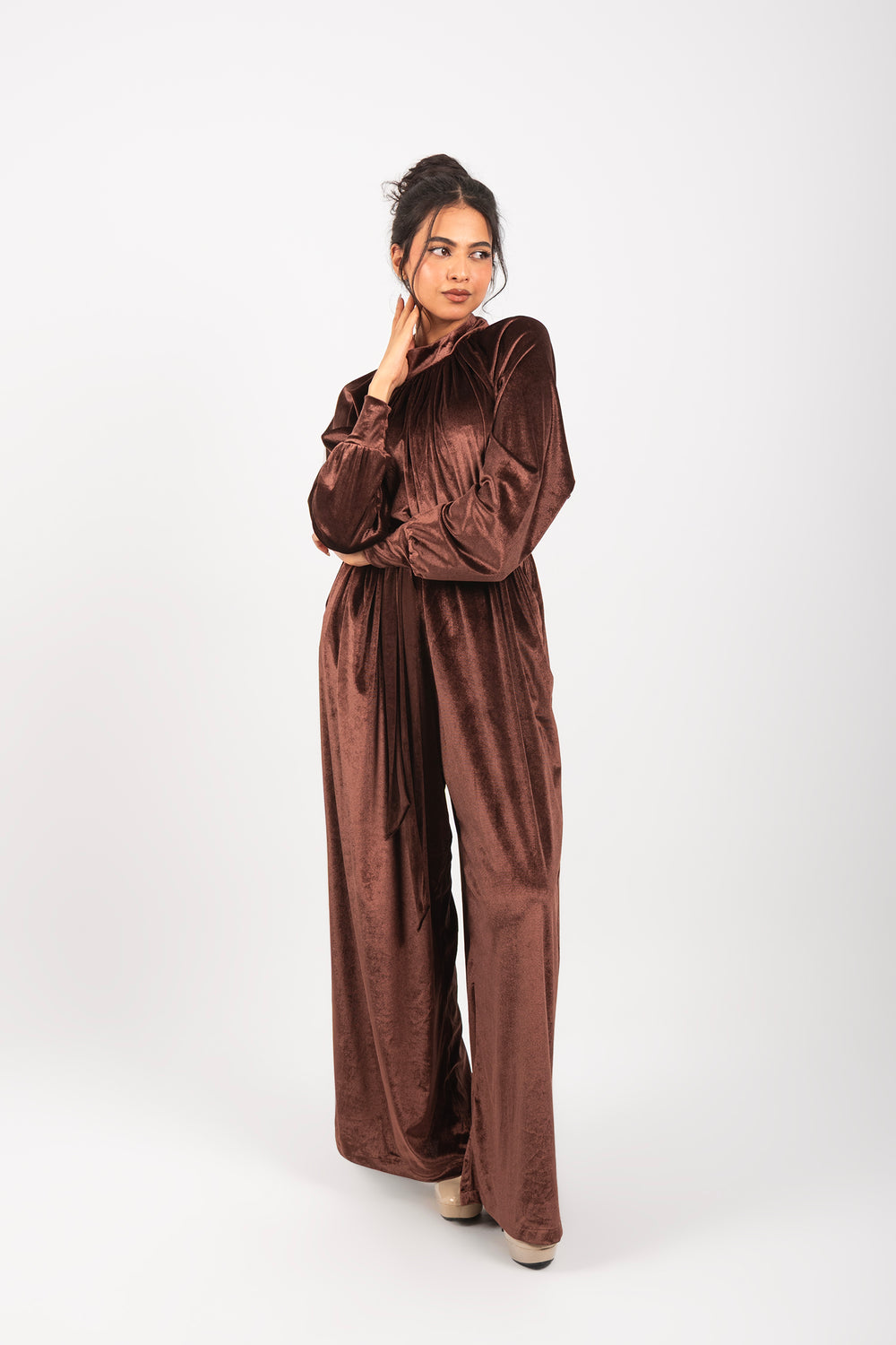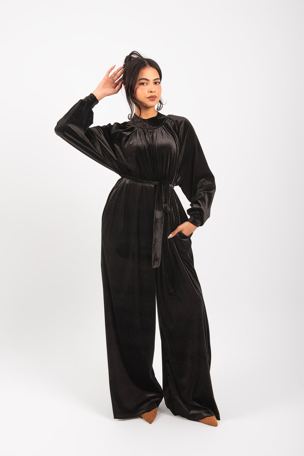Effortless elegance in one piece. The Flow Jumpsuit combines a high-fashion silhouette with the comfort of premium velvet. Designed for a seamless, modest look that moves with you.